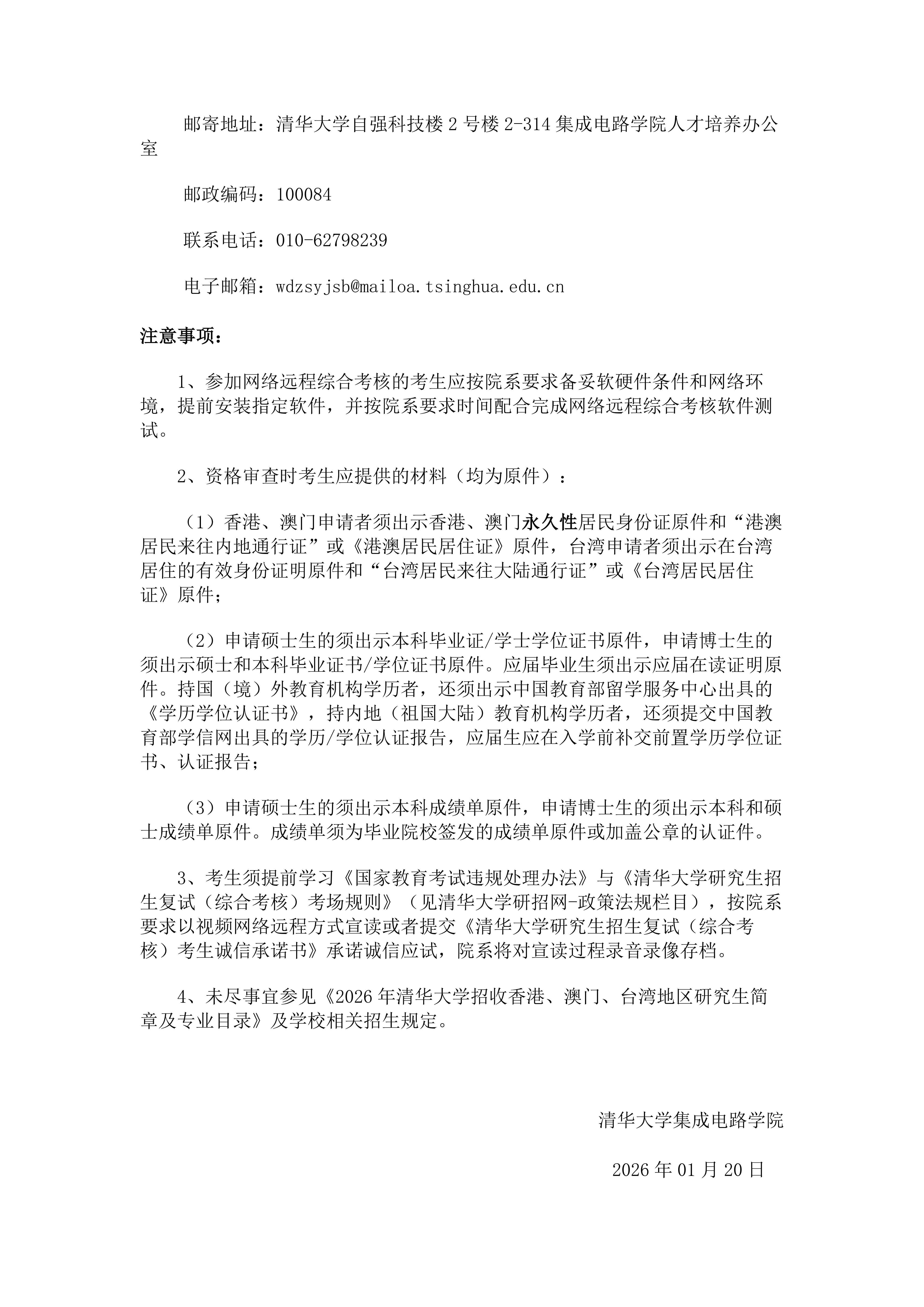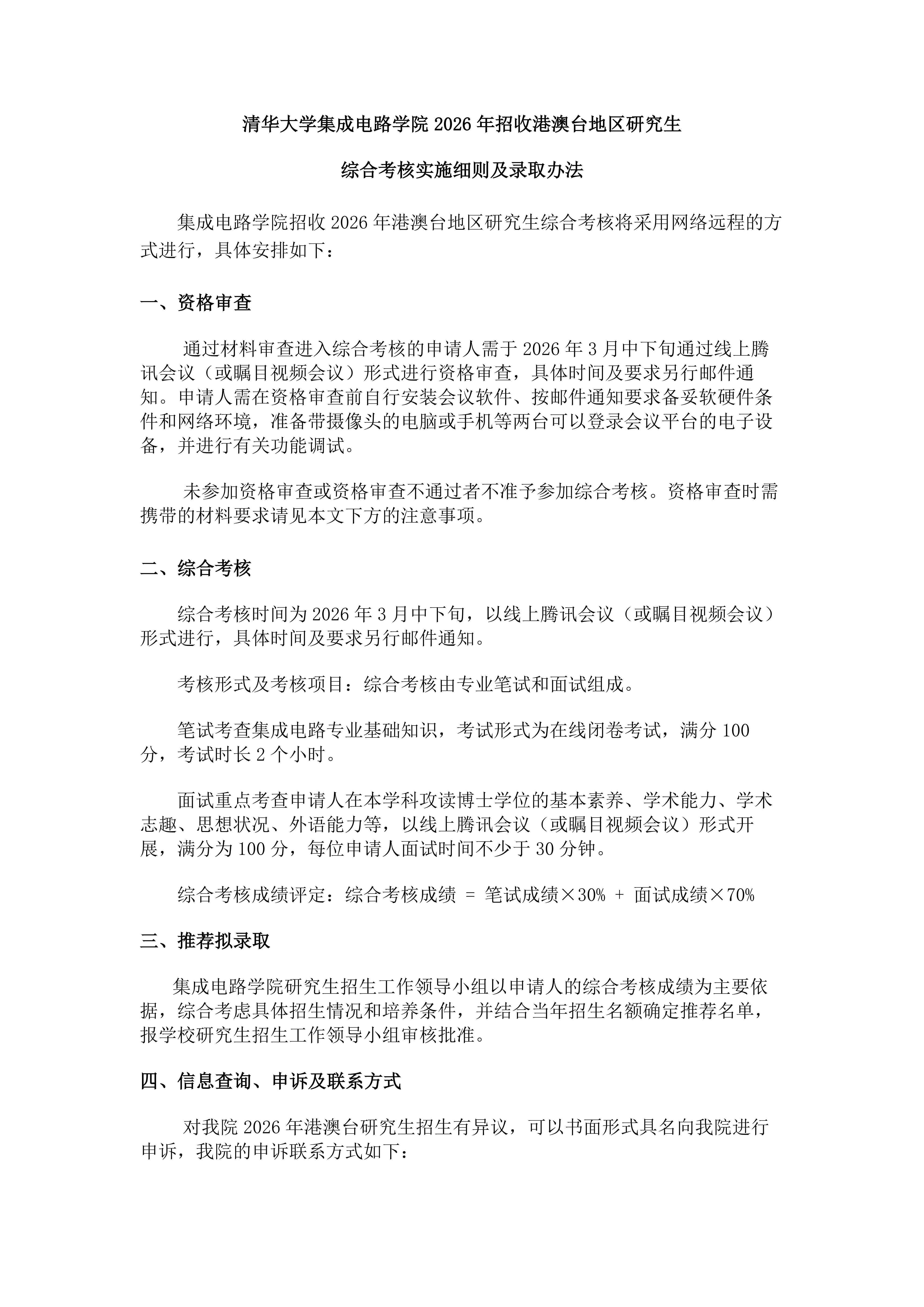 清华大学集成电路学院2026年招收港澳台地区研究生综合考核实施细则及录取办法